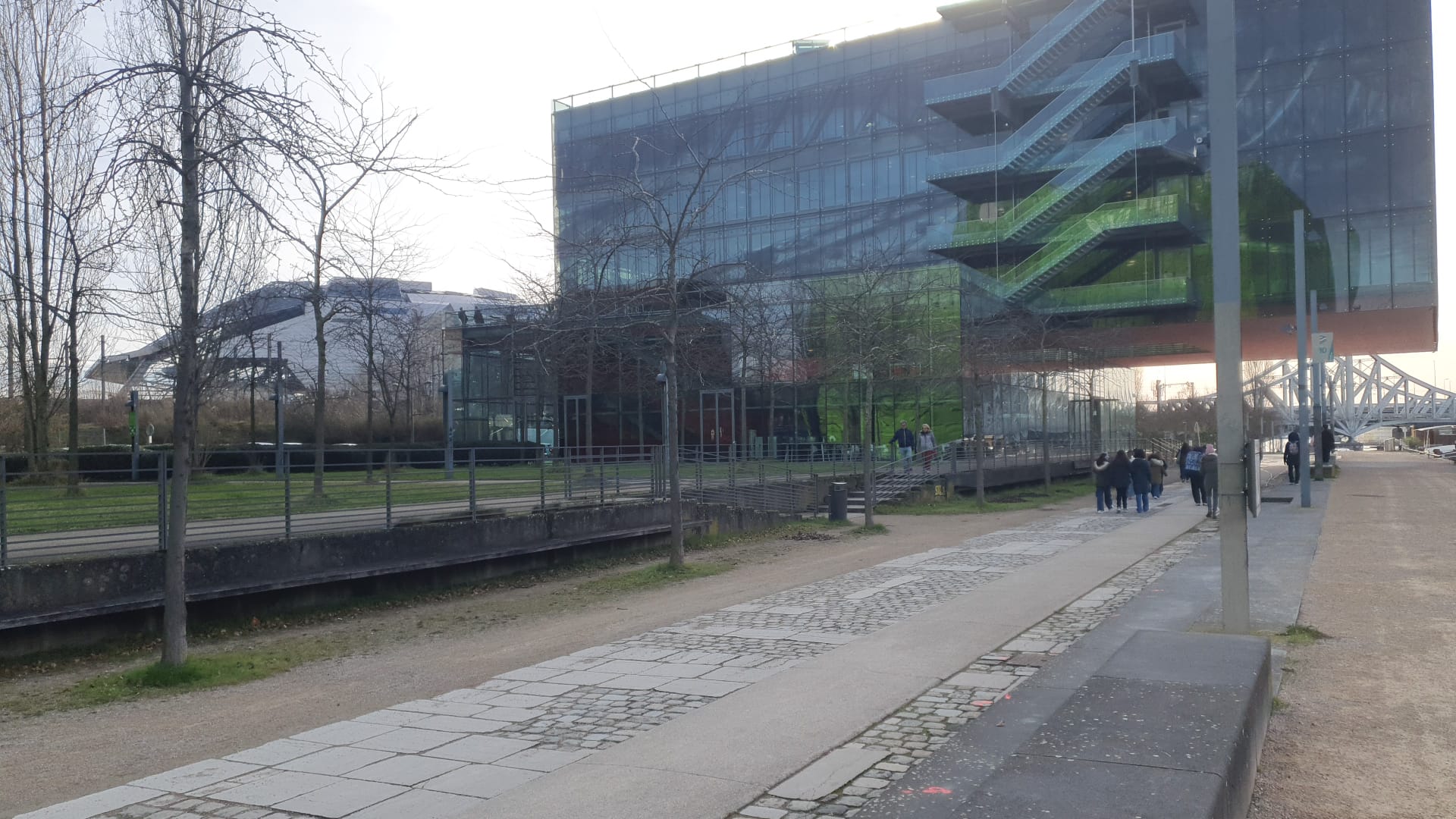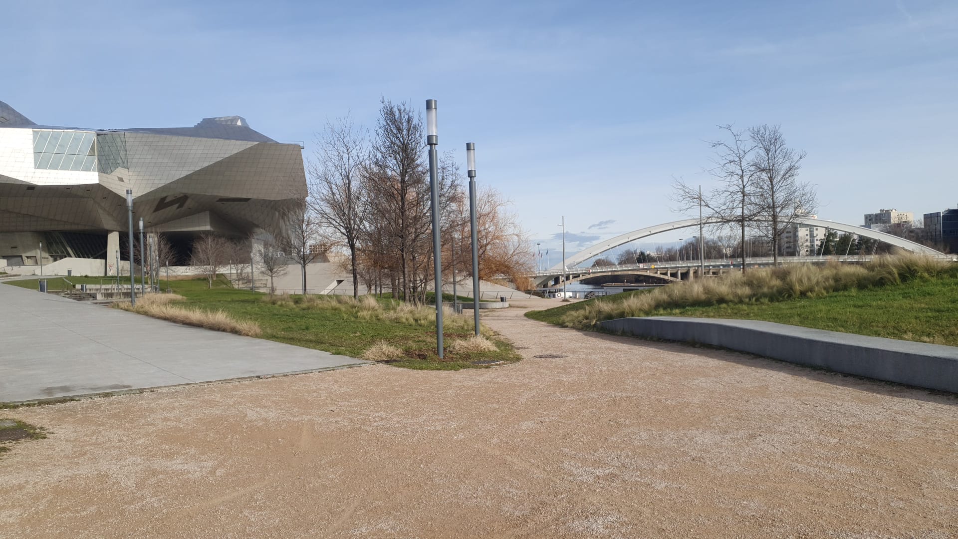 Partis de l'esplanade François Mitterrand au pied de l'Hôtel de Région, nous avons parcouru différents lieux qui témoignent de la modernité du quartier, construit au fil du temps sur d'anciens marécages : la marina ou darse, entre le centre commercial et les nouveaux immeubles HQE* tels que le Monolithe, le quai Arlès-Dufour, puis le quai Rambaud en bord de Saône, où les structures modernes comme le Cube Orange voisinent avec les vestiges industriels et portuaires comme la Sucrière (devenu musée), les deux ponts roulants, etc. La promenade le long de la rivière nous a ramenés au confluent puis à la CSI par le Musée des Confluences et la passerelle Raymond Barre.
